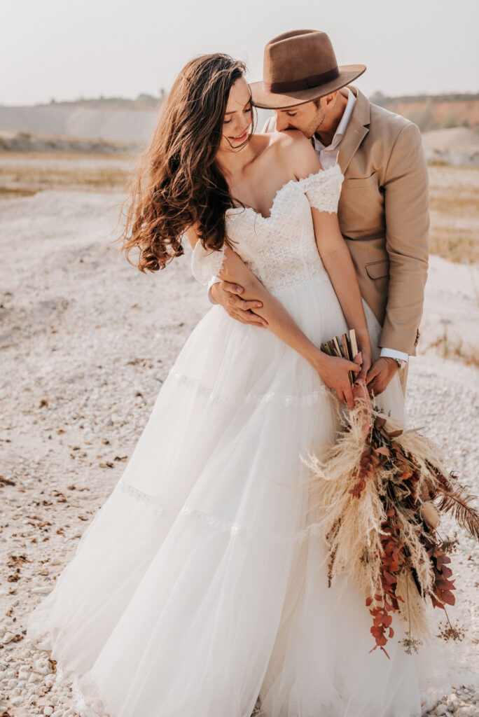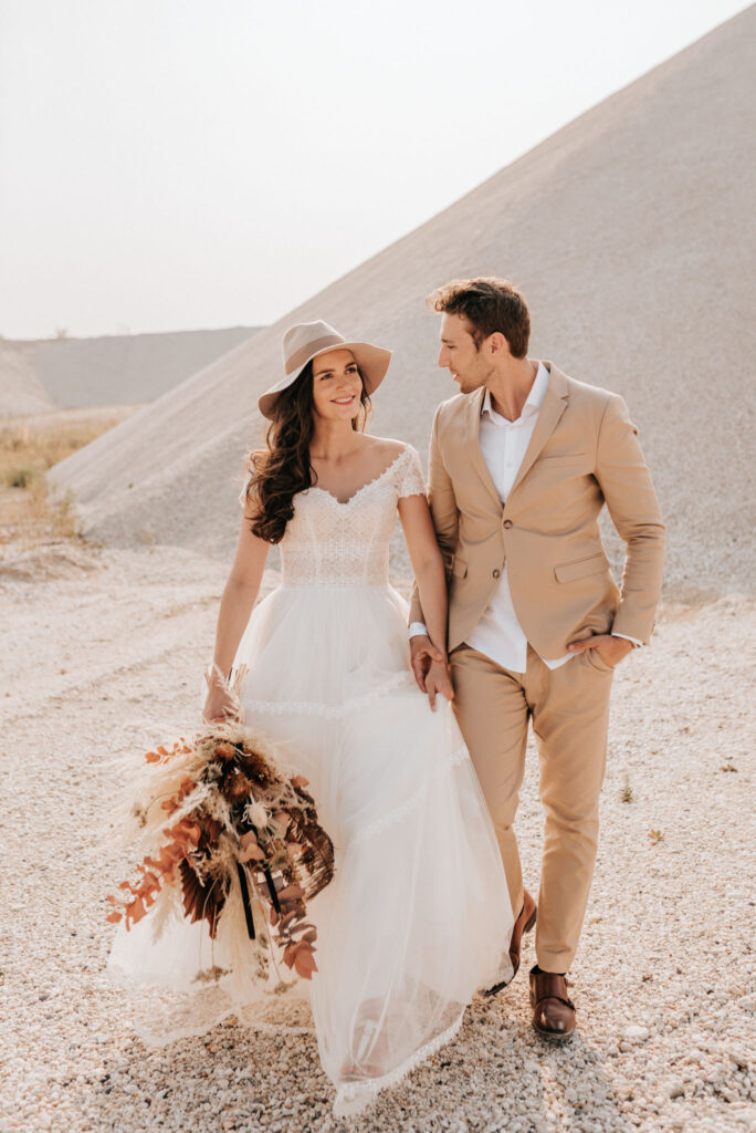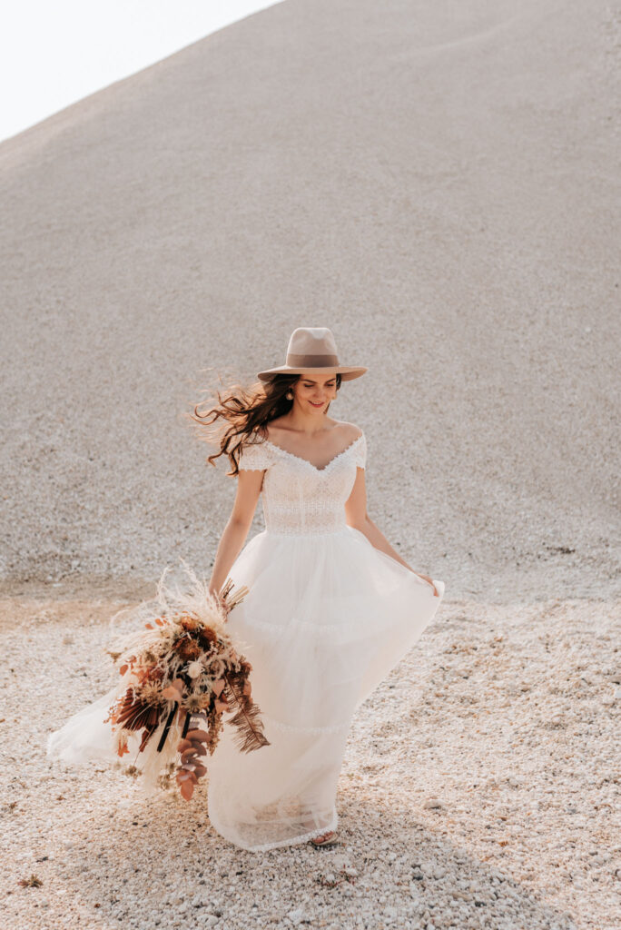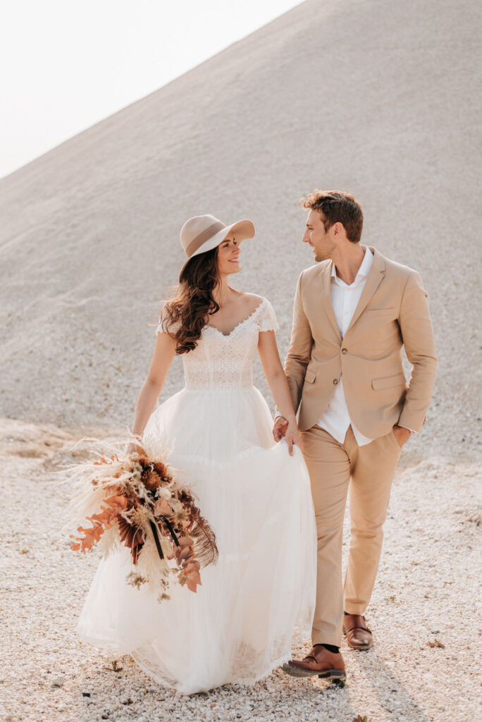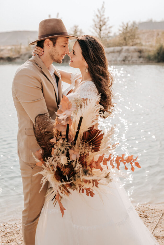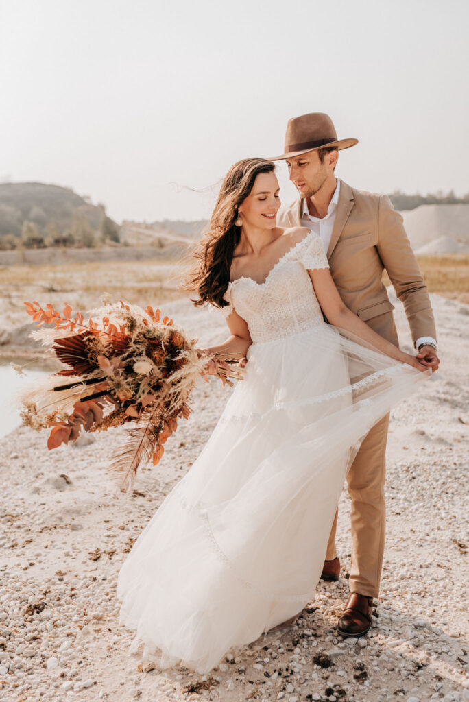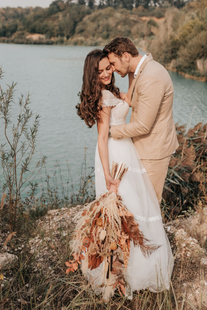 Dieses Shooting war eine knappe, aber zauberhafte Nummer und die Bilder, die an diesem Tag innerhalb kürzester Zeit entstanden sind, sprechen ihre eigene Sprache. Wir haben uns für das Shooting einen Hot Spot am Wasser ausgesucht. Das besondere an diesem Ort waren neben dem Paar, das türkisblaue Wasser und die Pyramiden aus Kies, die dem Bohemian in gewisser Weise auch einen derben Touch verliehen haben.