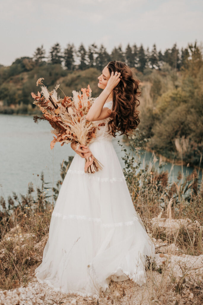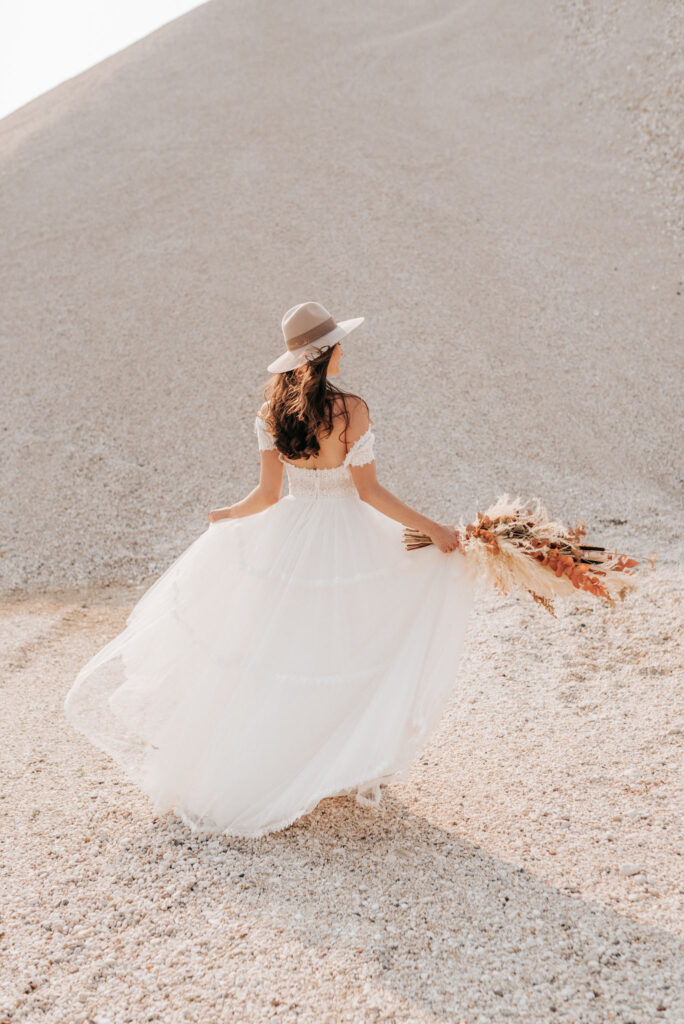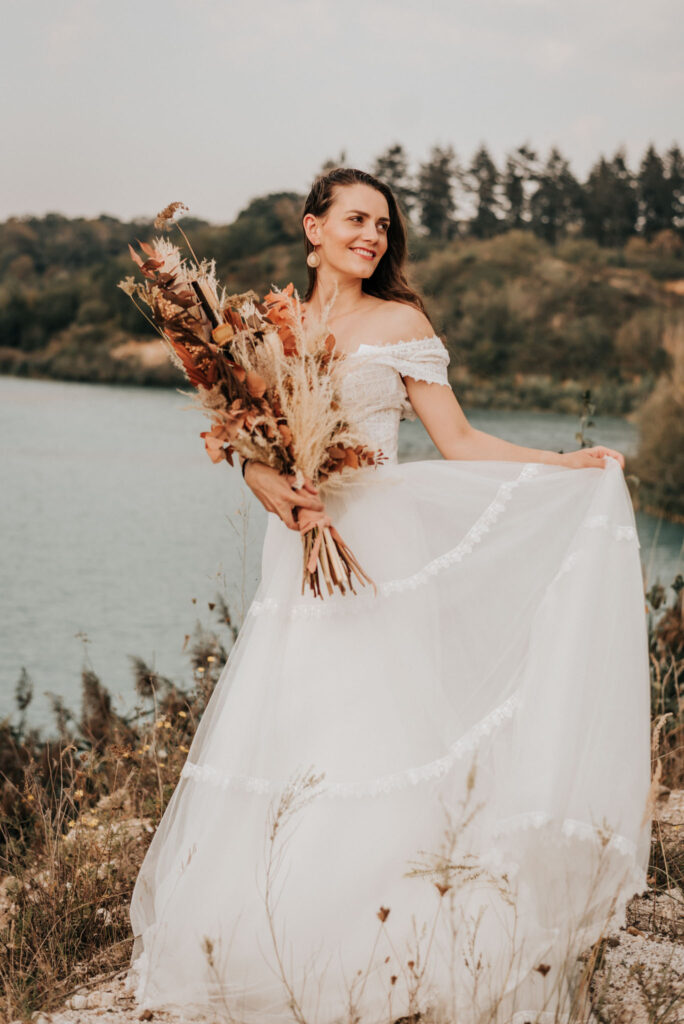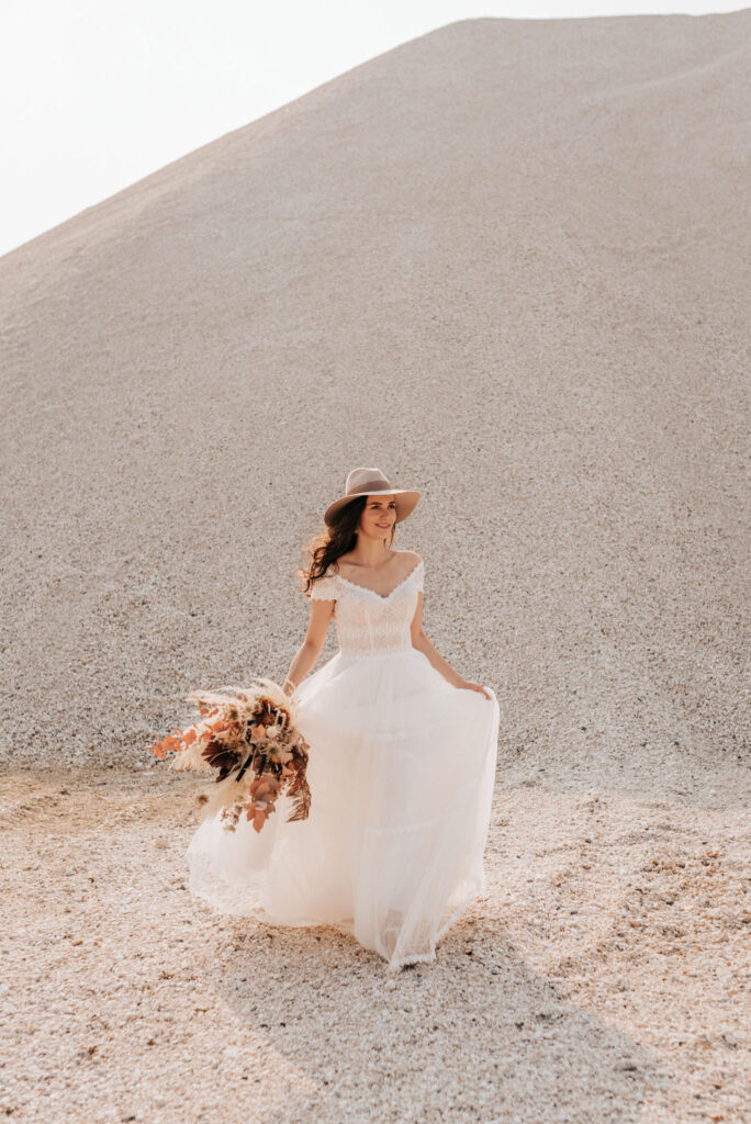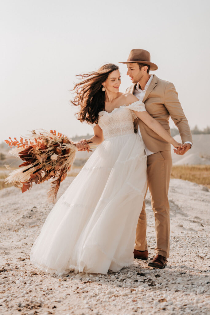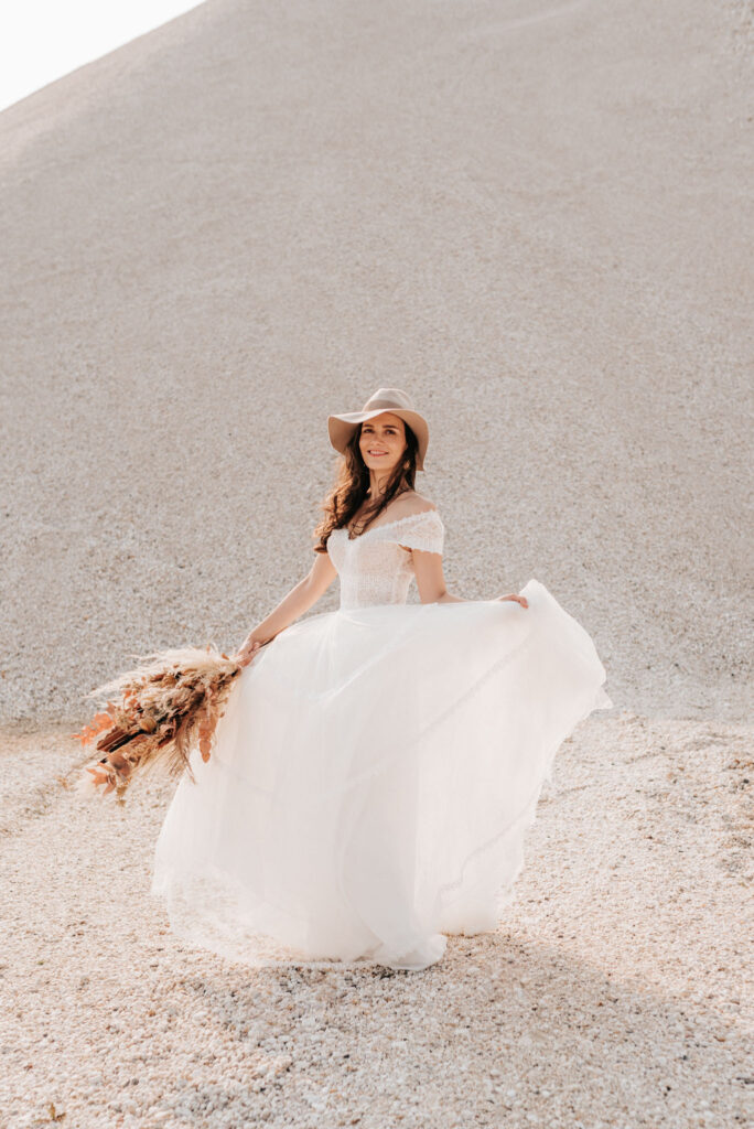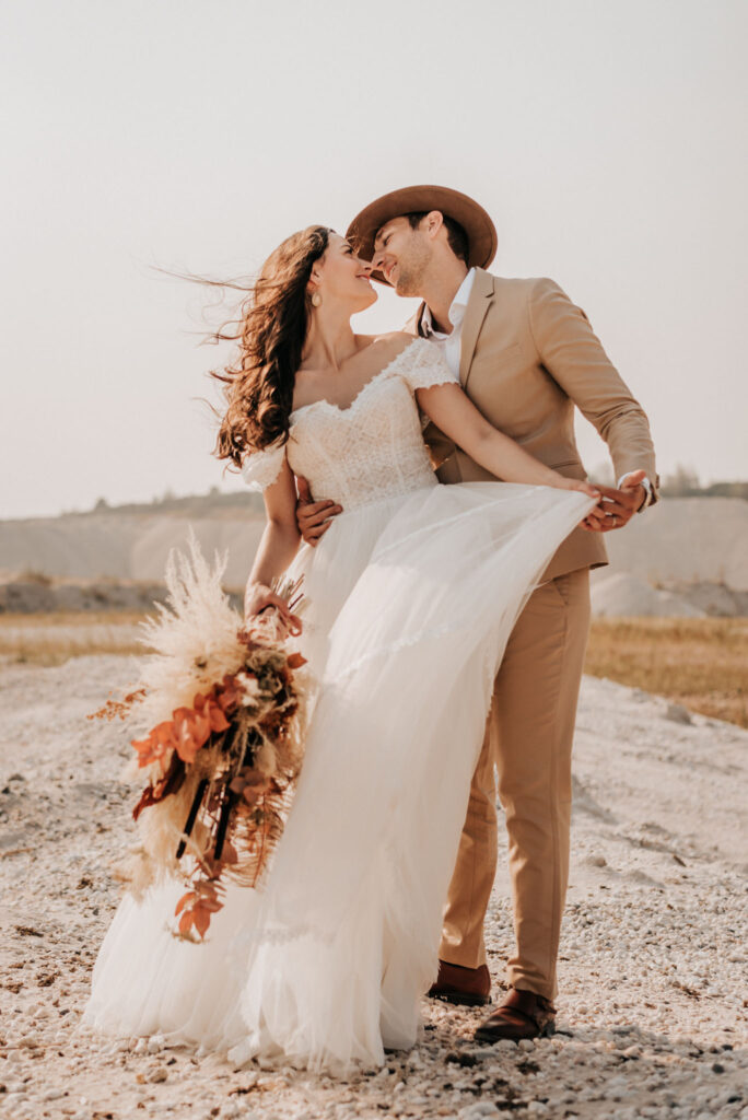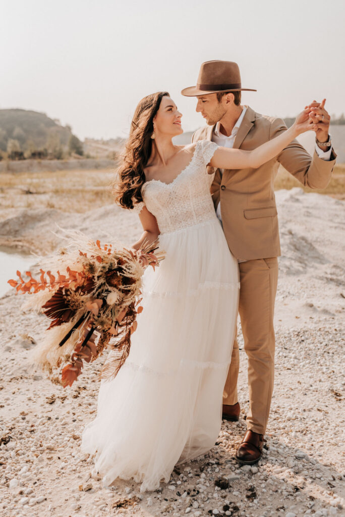 Dieses Shooting war eine knappe, aber zauberhafte Nummer und die Bilder, die an diesem Tag innerhalb kürzester Zeit entstanden sind, sprechen ihre eigene Sprache. Wir haben uns für das Shooting einen Hot Spot am Wasser ausgesucht. Das besondere an diesem Ort waren neben dem Paar, das türkisblaue Wasser und die Pyramiden aus Kies, die dem Bohemian in gewisser Weise auch einen derben Touch verliehen haben.