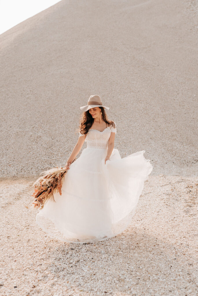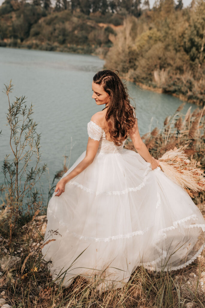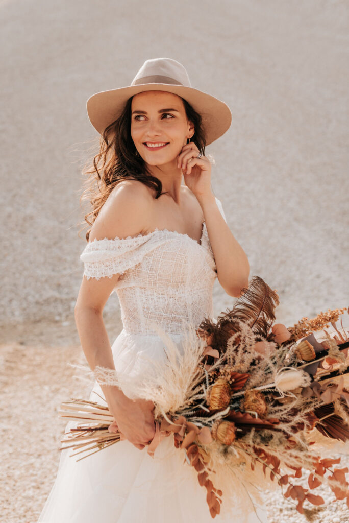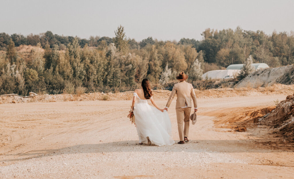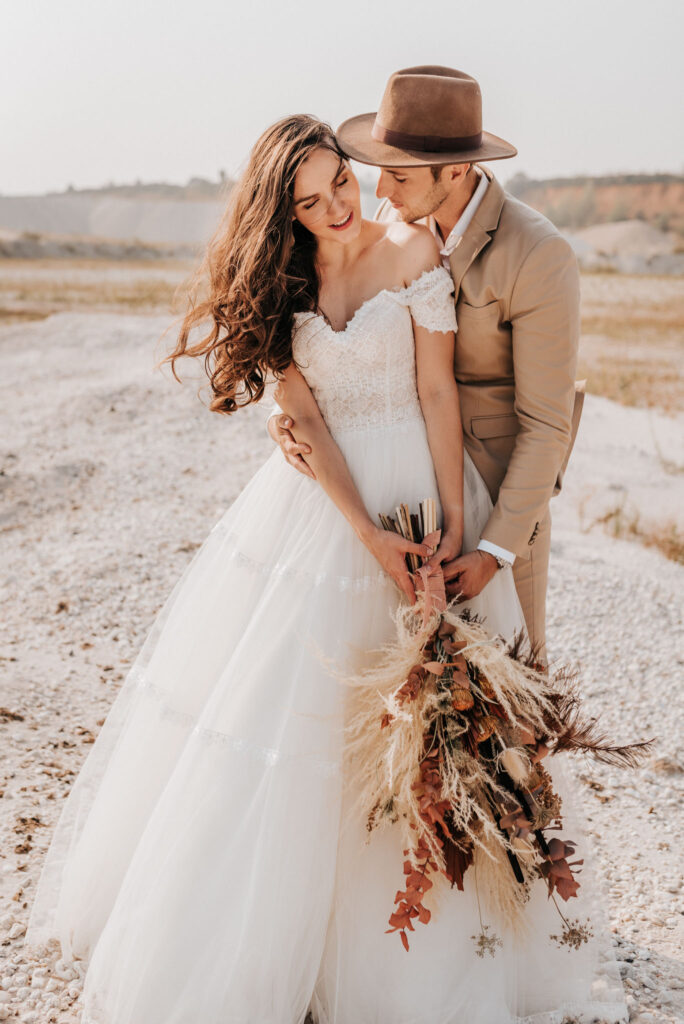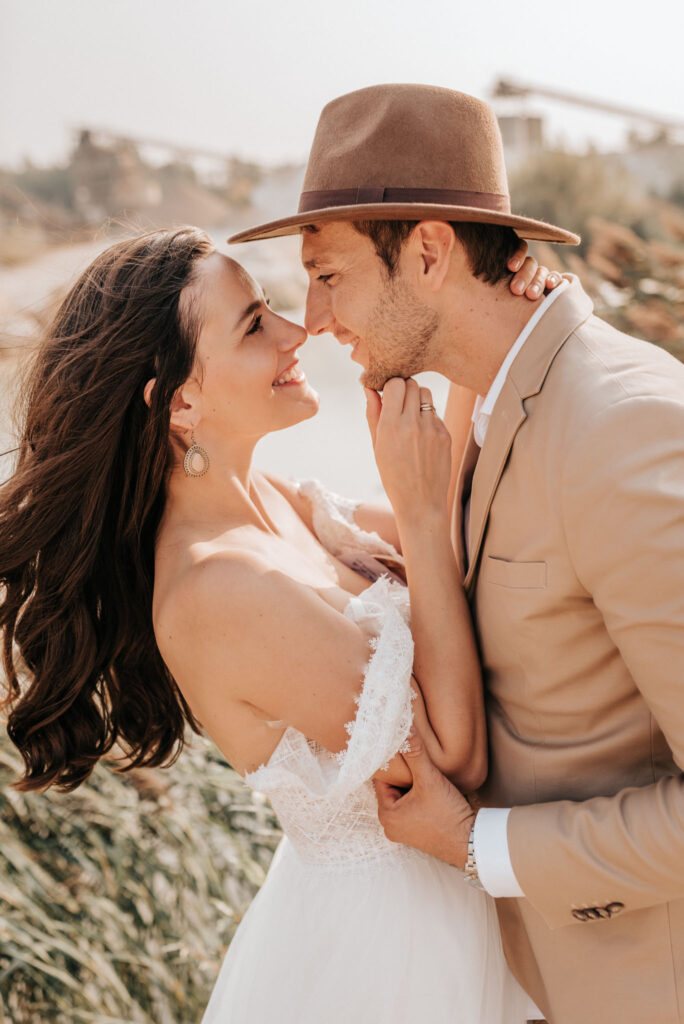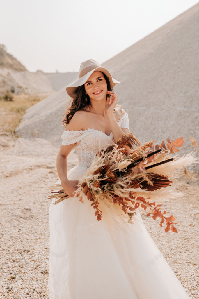 Dieses Shooting war eine knappe, aber zauberhafte Nummer und die Bilder, die an diesem Tag innerhalb kürzester Zeit entstanden sind, sprechen ihre eigene Sprache. Wir haben uns für das Shooting einen Hot Spot am Wasser ausgesucht. Das besondere an diesem Ort waren neben dem Paar, das türkisblaue Wasser und die Pyramiden aus Kies, die dem Bohemian in gewisser Weise auch einen derben Touch verliehen haben.