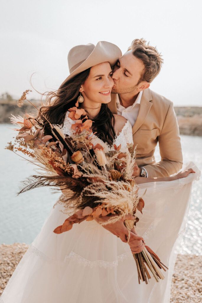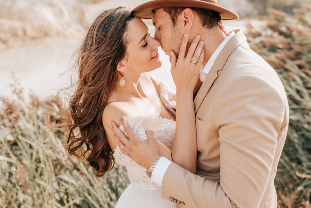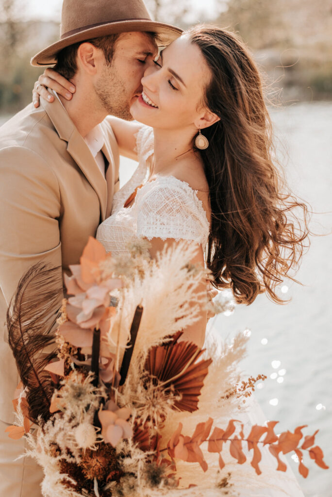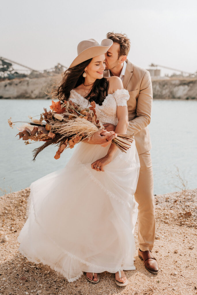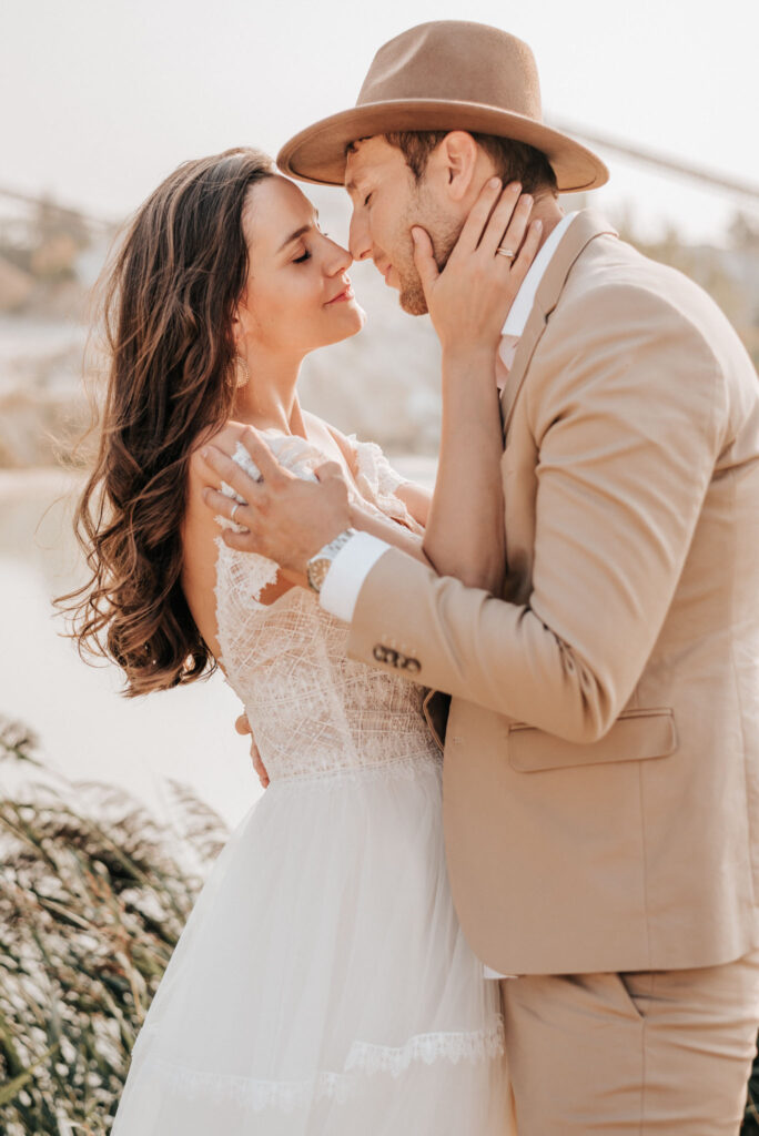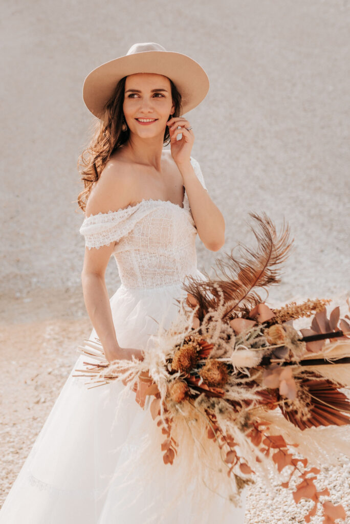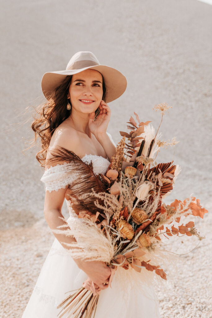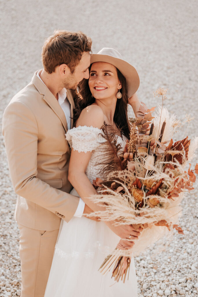 Dieses Shooting war eine knappe, aber zauberhafte Nummer und die Bilder, die an diesem Tag innerhalb kürzester Zeit entstanden sind, sprechen ihre eigene Sprache. Wir haben uns für das Shooting einen Hot Spot am Wasser ausgesucht. Das besondere an diesem Ort waren neben dem Paar, das türkisblaue Wasser und die Pyramiden aus Kies, die dem Bohemian in gewisser Weise auch einen derben Touch verliehen haben.
