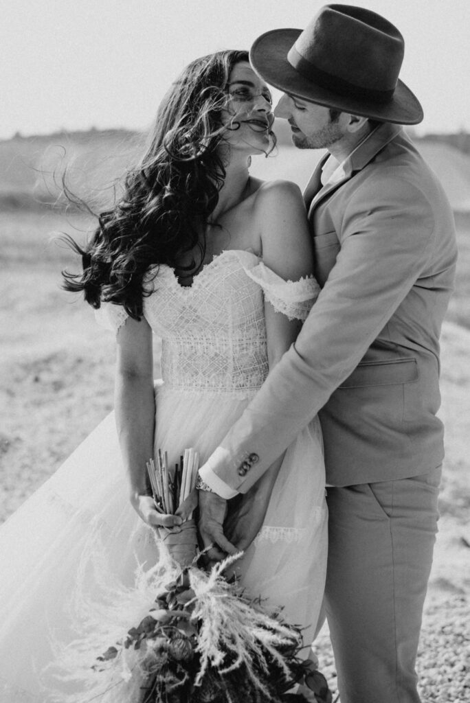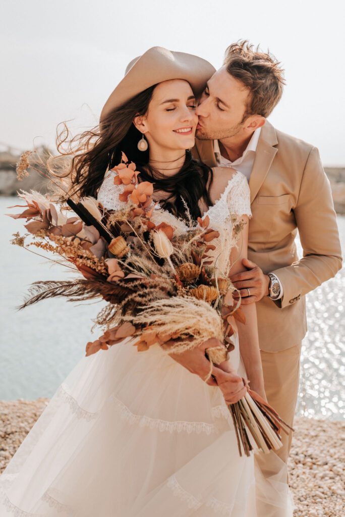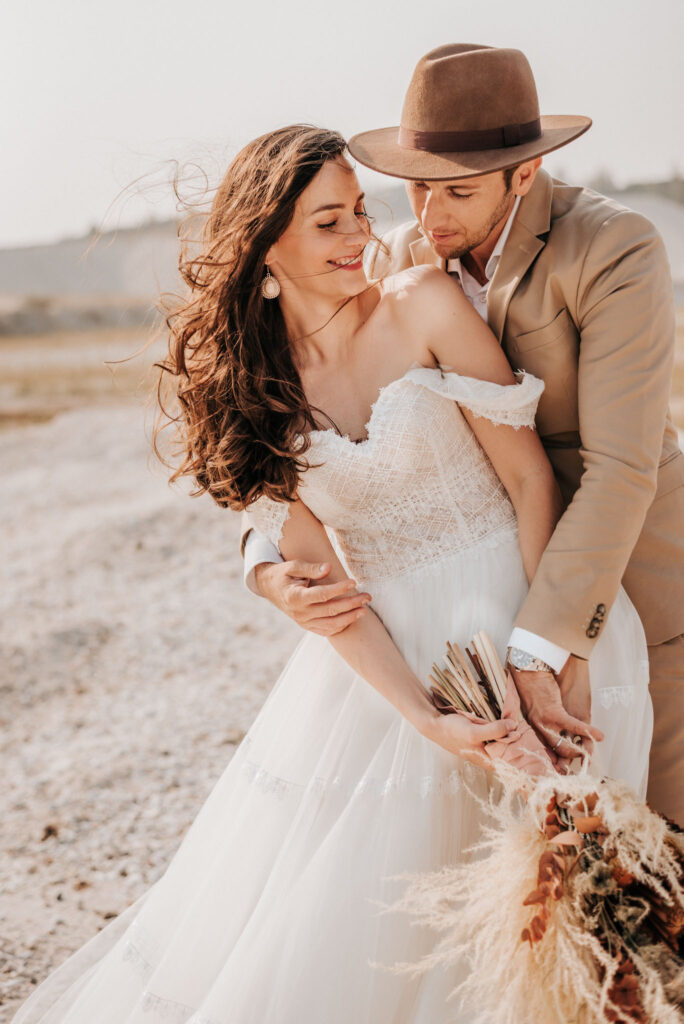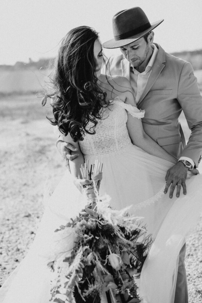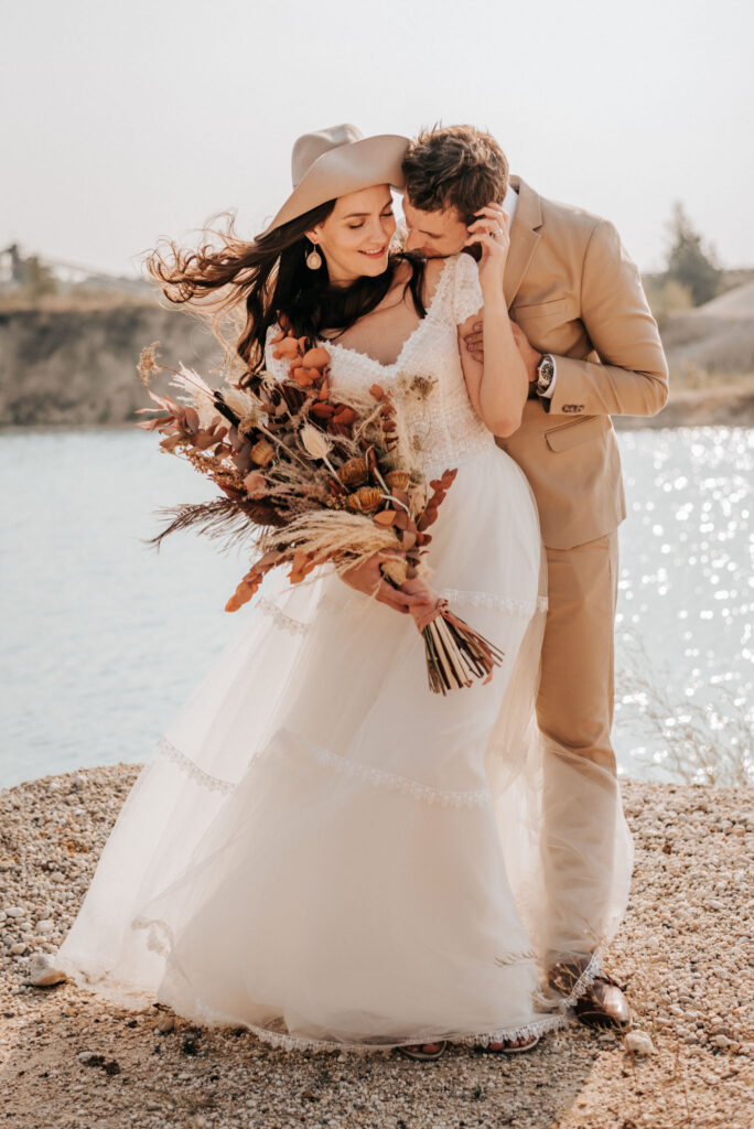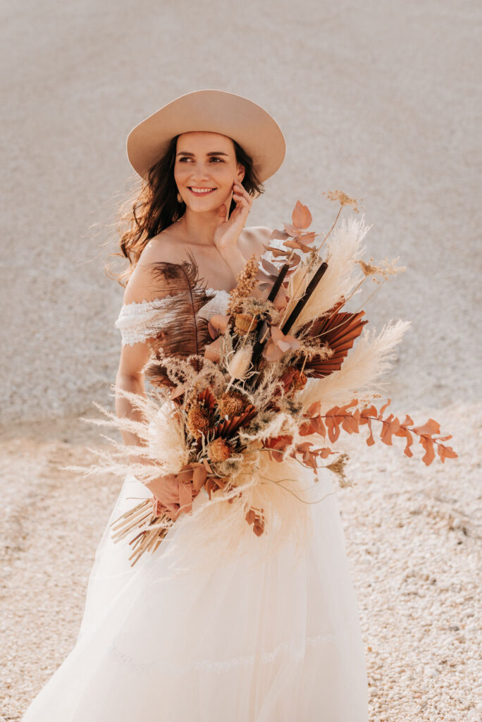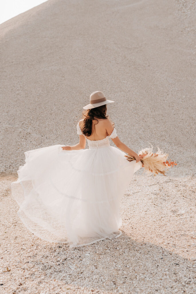 Dieses Shooting war eine knappe, aber zauberhafte Nummer und die Bilder, die an diesem Tag innerhalb kürzester Zeit entstanden sind, sprechen ihre eigene Sprache. Wir haben uns für das Shooting einen Hot Spot am Wasser ausgesucht. Das besondere an diesem Ort waren neben dem Paar, das türkisblaue Wasser und die Pyramiden aus Kies, die dem Bohemian in gewisser Weise auch einen derben Touch verliehen haben.